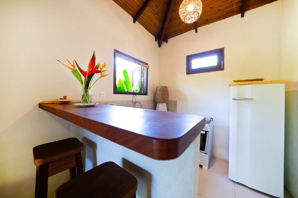 C'est un espace calme et plein de style à 200 mètres de la plage, au milieu de la végétation indigène ! Nous sommes LGBTQIAP+ friendly et parce que nous sommes loin du centre de la communauté, nous profitons du silence et de la tranquillité, mais à cinq minutes de l'agitation ! La suite avec vue sur les arbres est une garantie de repos. La cuisine avec plafond en piaçava est belle et est préparée avec le nécessaire. La salle de bain dispose d'espaces réservés qui garantissent votre intimité. Détendez-vous dans cet espace ! Vous allez adorer !