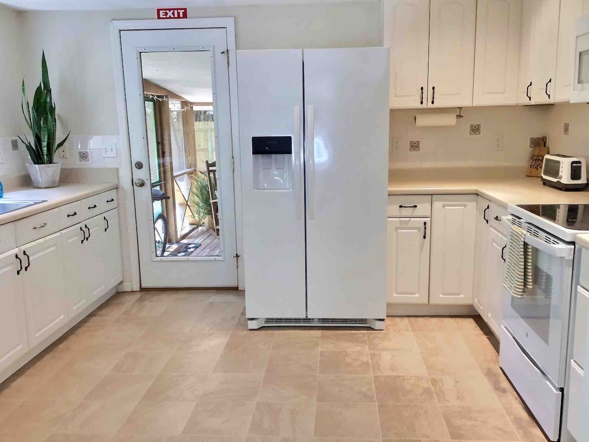 Profitez de cette maison de 2 chambres/2 salles de bain dans un quartier pittoresque niché dans le quartier historique de St. Marys, en Géorgie. Porche arrière avec moustiquaire, ventilateurs de plafond, salon et table à manger pour 6 à 8 personnes. Le porche donne sur une grande cour arrière, avec un barbecue à gaz. À 3 pâtés de maisons, vous trouverez le parc riverain Howard Gilman. Transport vers l'île de Cumberland, randonnée, visites, baignade et beachcombing, vélo, camping, kayak, pêche et autres activités.