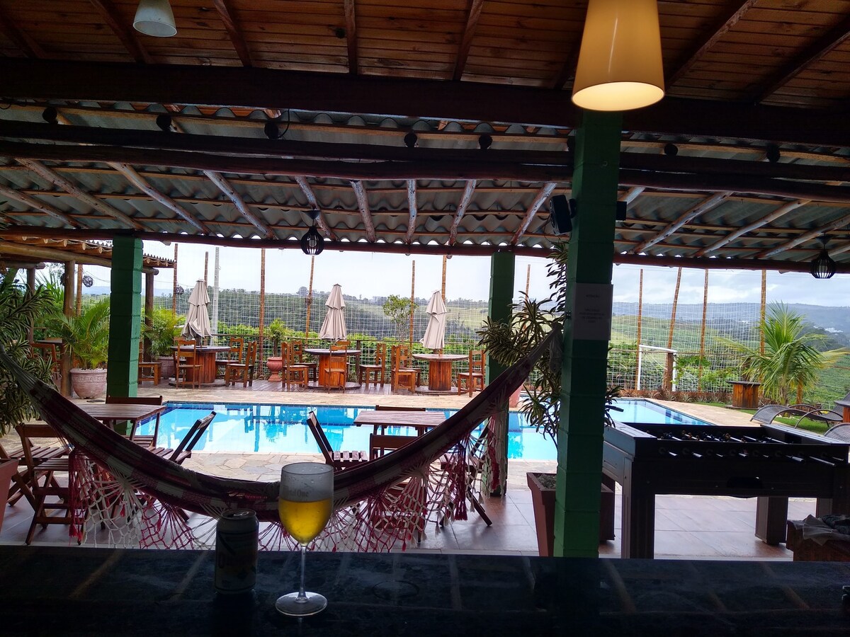 Détendez-vous en famille dans un endroit accueillant, avec de nombreuses options de loisirs, comme une piscine chauffée, un terrain de football, une aire de jeux, une table de jeux, un billard et une table de ping-pong. Profitez d'une belle vue, d'un endroit calme, proche du centre et des barrages ! En bordure de la nouvelle Route des Fruits, venez découvrir la nouvelle piste cyclable, qui conquiert de nombreux cyclistes de la région et de São Paulo !