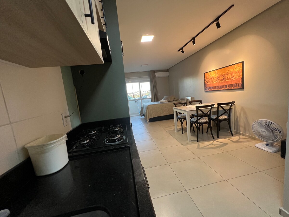 Appartement situé à l'intérieur de l'hôtel Sky Borges, avec toute l'infrastructure : parking gratuit, piscine chauffée, sauna, jacuzzi, espace enfants, salle de musculation, service de ménage avec changement de linge de lit, de bain et nettoyage de la chambre (LES FEMMES DE MÉNAGE NE FONT PAS LA VAISSELLE). Air, smart TV 42", TV par câble, wi-fi et une kitchenette avec frigo-bar, four électrique, cooktop électrique, air fryer et micro-ondes. Le petit déjeuner n'est pas inclus mais peut être consommé et payé directement au moment du départ.