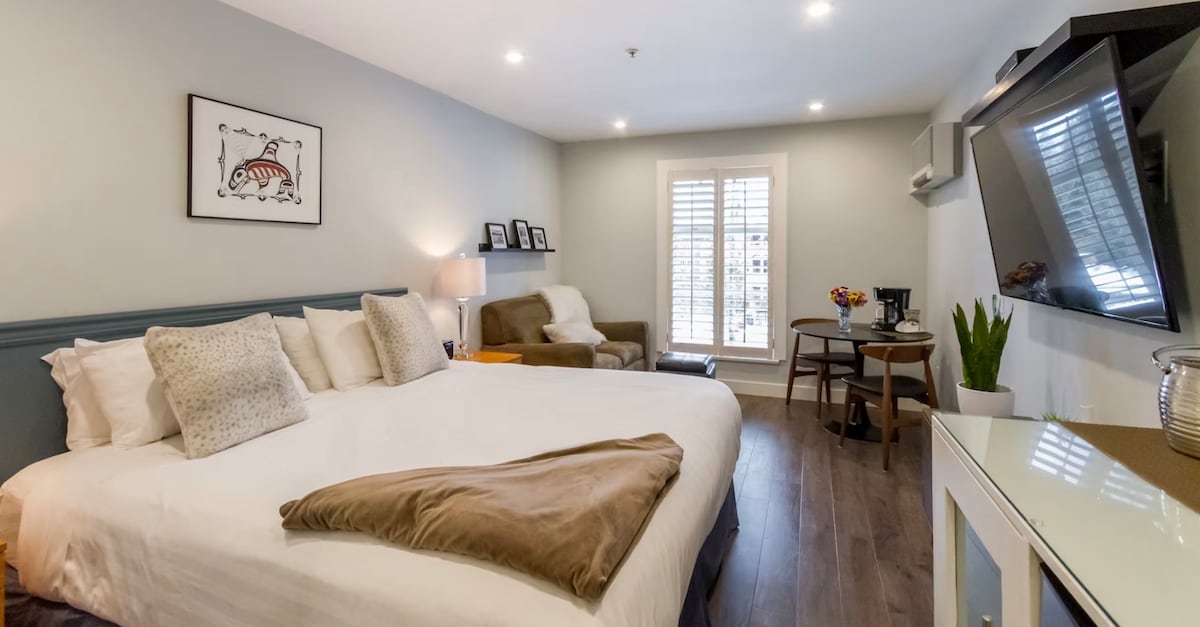 Située au cœur du centre-ville de Wolfville, la suite 201 est la chambre spacieuse parfaitement située pour découvrir Wolfville - avec une vue idéale pour regarder les gens. Notre ville est exceptionnellement accessible à pied et pleine d'ambiance. Avec une cuisine complète, pommeau de douche à effet pluie, télévision connectée 55", mobilier confortable, laveuse/sécheuse, grandes fenêtres, vous voudrez ne jamais avoir à partir ! Bien que la suite soit au deuxième étage, ne vous inquiétez pas car nous avons un ascenseur pour plus de confort pendant vos voyages