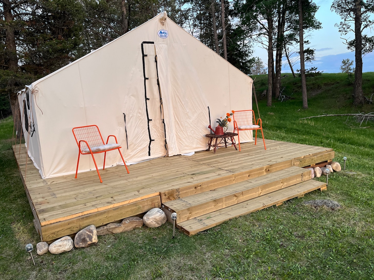 Le meilleur de la vie intérieure et extérieure. Sentez-vous comme chez vous dans la tente de glamping luxueusement aménagée à seulement 12 minutes du sud de Calgary. Tente privée et isolée située sur un ruisseau avec vue tranquille, dotée d'un four chaud, d'un mini-réfrigérateur, d'une cuisine extérieure, d'une douche chaude, de toilettes à chasse d'eau et de prises de courant. Beaucoup à faire ou rien du tout, de l'exploration des 166 km de sentiers entretenus à proximité à Bragg Creek, à la pêche dans le ruisseau depuis votre terrasse, en passant par les jeux sur pelouse dans votre espace privé d'un acre.