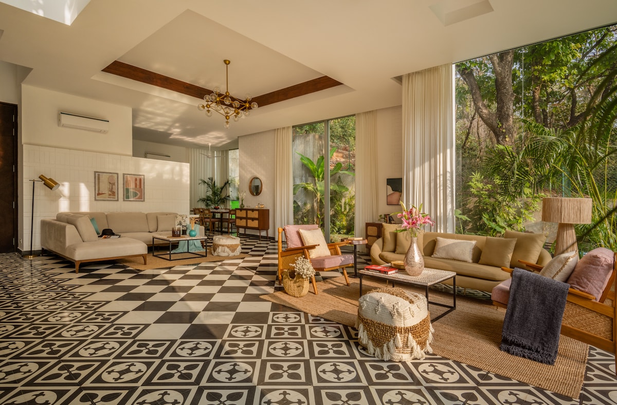 Cette maison design est un joyau au cœur de Goa. Décorée avec des peintures collectées dans toute l'Inde et des meubles contemporains, cette villa offre tous les équipements dont vous auriez besoin pour passer un moment de détente en famille ou entre amis. La chambre principale, au premier étage, dispose d'un magnifique balcon où vous pourrez déguster votre thé/café ou le coucher de soleil. Vous pouvez également avoir des papillons et des oiseaux pour la compagnie, grâce à la verdure soigneusement plantée qui vous entoure. Sûrement une maison loin de chez vous !