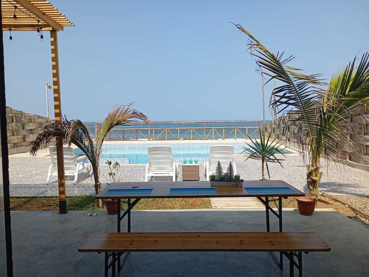 Nous sommes dans une copropriété privée avec seulement 15 maisons en face de la plage. Nous sortons directement sur le sable où il y a un bosquet avec des fauteuils et un coin feu. Les chambres sont totalement indépendantes. La principale est au deuxième étage et les 3 autres dans des bungalows autour des parties communes et de la piscine. Il y a deux terrasses et une salle intérieure qui offre beaucoup d'espace social. Toutes les chambres et terrasses ont vue sur la mer. Mer chaude, longue plage, beaux couchers de soleil et délicieuse nourriture