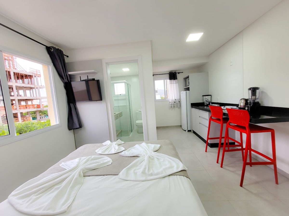 Curta uma experiência elegante neste Flat Studio de Altíssimo Padrão, Super bem localizado, com uma infra-estrutura única, com Sauna, Academia, Sala de Jogos, Piscina com borda infinita incluído para o uso dos hóspedes Também há comodidades pagas a parte como Boliche e Churrasqueira No Centro de Itapema, a poucos passos da Praia e a poucos minutos de carro do Expocentro de Balneário Camboriú, com acesso rápido a BR 101 Ideal para casal, tanto para momentos de lazer como para viagens de negócios.
