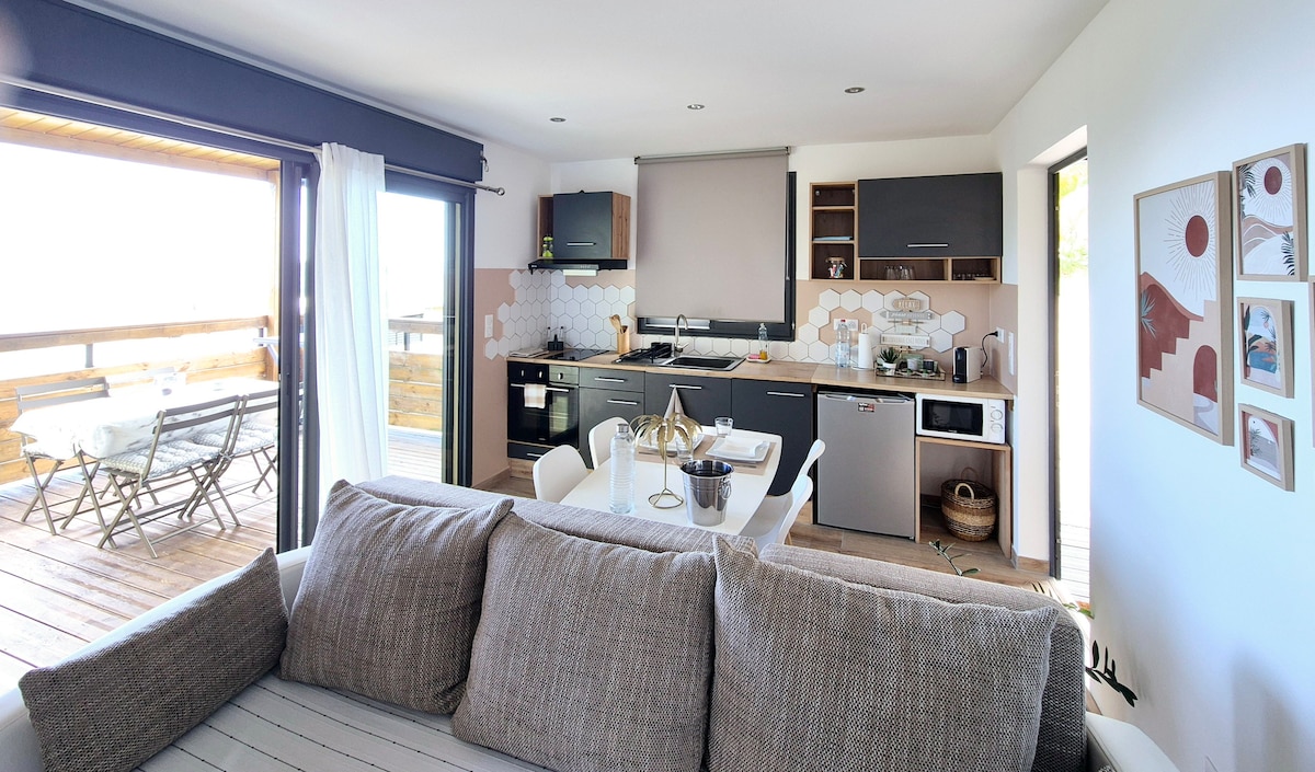 Notre meublé 4* est entièrement équipé pour 2 adultes , non adapté aux enfants . Une chambre climatisée, smart tv, d'un lit Queen size très confortable, grande baie vitrée donnant sur la terrasse extérieure avec vue sur la piscine et la mer, Une superbe salle d'eau, un très belle douche à l'italienne et d'un wc. D'un séjours, d'une cuisine entièrement équipée. De deux grandes terrasses extérieur avec une magnifique vue, une partie couverte , d'un jacuzzi SOFTUB et d'une piscine au sel chauffée.