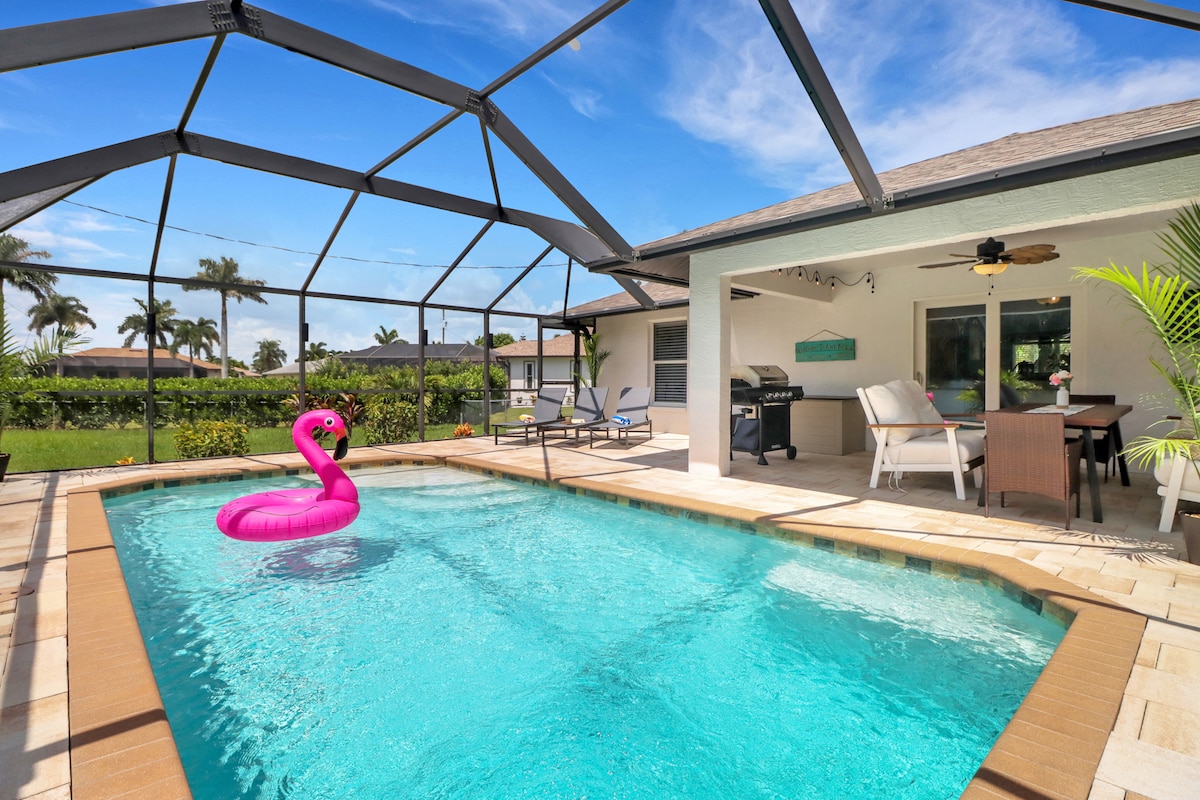 -5 min to Downtown Cape/10 min to Yacht Club Beach, 20 min to Causeway Beach, 25 min to Ft Myers & Sanibel Beach -Tropical fenced backyard w/ pool, hot tub, gas firepit, swing chair, hammock & Blackstone grill -Beach essentials, boogie boards, umbrellas, beach wagon, cooler & chairs -Board games, ping-pong, corn-hole, darts, 2 kayaks+life jackets -2 Beach Cruiser bikes + helmets -Relaxing enclosed covered patio + string lights, neon sign & grass wall -Canal access for kayak launch 5 min away!