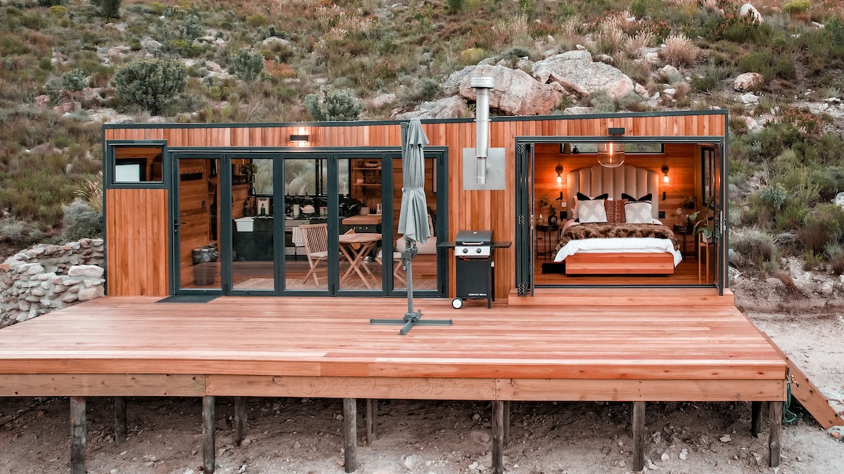 Nous sommes fiers de présenter l'expérience de vie en cabane à son meilleur. - Une fusion du luxe, du confort et de l'environnement exquis des fynbos. La Solace Cabin est nichée dans un paysage indigène situé dans une ferme de 200 hectares à Rawsonville, entourée par la chaîne de montagnes Matroosberg.