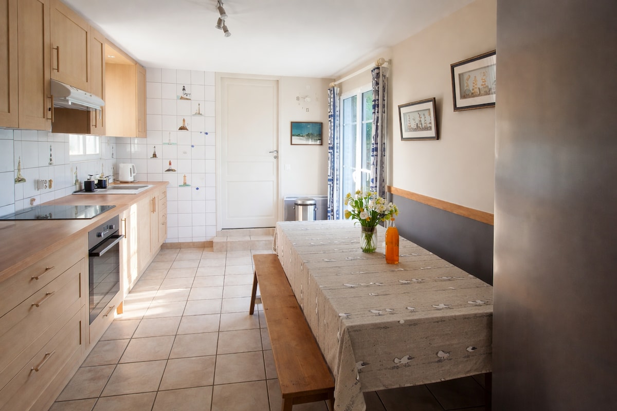 Maison années 20 entièrement rénovée dans un style contemporain scandinave. Jardin clos et à l'abris des regards de 300 m2 orienté Sud-Est. Situation idéale à 200 m du bourg et à 5' à pied des plages et de la base nautique. La détente absolue ! La maison est officiellement classée par le Ministère Chargé du Tourisme. C'est LA garantie supplémentaire de ne pas se tromper pour vos vacances...