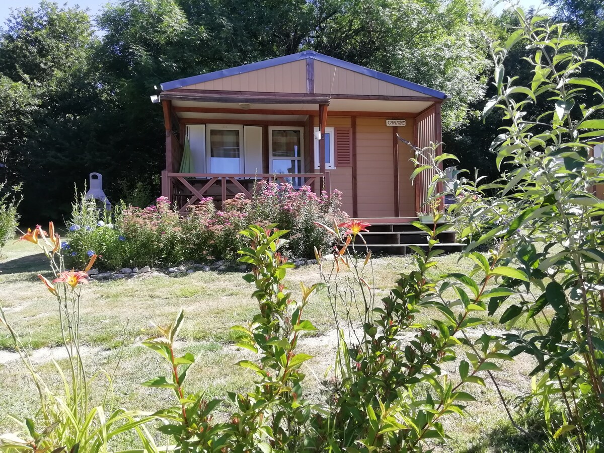 chalet en bois de 4 pers, tout confort neuf avec deux chambres aménagées, une cuisine complètement équipée, un coin repas, une télé écran plat avec une banquette. Une salle de bain avec douche et WC séparé. Une terrasse semi couverte et store, jardin et parking privé, barbecue , vue sur la piscine. Les espaces privés et l'intimité sont respectés. Coin repos et détente, plancha, livres, chaises longues...
