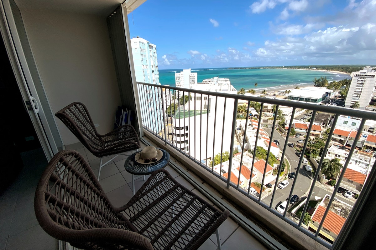 Profitez d'une expérience élégante dans cet hébergement central à seulement 7 minutes en voiture de l'aéroport SJU. Accès direct à la plage, parc passif, salle de sport, piscine, espace barbecue, terrain de basket, court de tennis, « loundromat » au premier niveau. Vous apprécierez votre café ou votre vin dans le fauteuil suspendu du balcon rustique-moderne confortable où vous pourrez apprécier la vue sur la plage et la ville. Suivez @buenavidabeachstudio