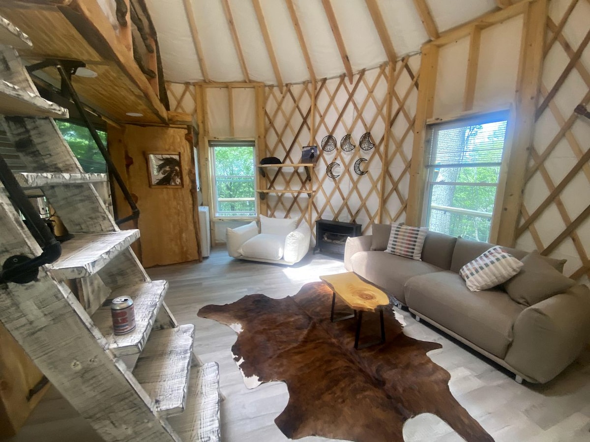 Plongez dans la magie de « Starlight Yurt ! » Niché juste à côté de la Blue Ridge Parkway, ce sanctuaire spacieux offre un espace de vie radieux, une cuisine astucieuse, un loft spacieux, une salle de bain complète avec baignoire sur pattes et un jacuzzi privé avec vue sur la montagne. Détendez-vous dans la tranquillité avec des équipements et un charme illimités. Jenny 's n'est pas seulement une yourte, c'est une escapade en montagne enchanteresse pour vous rafraîchir l'âme ! Réservez dès maintenant pour créer des souvenirs intemporels dans un havre de paix inoubliable niché au cœur des montagnes Blue Ridge !