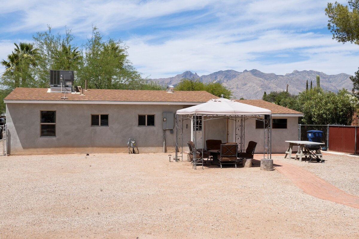 Maison moderne et élégante de 2 chambres, 2 salles de bain, buanderie attenante, notre maison se trouve sur un grand terrain privé de 1/4 acre avec un grand parking. Le quartier est un quartier familial sûr, peu fréquenté, qui se trouve à distance de marche de grands magasins, de restaurants ou simplement pour profiter du parc voisin. À seulement 2,4 miles de l'Université de l'Arizona et à 1,9 miles de l'UMC. La chambre principale dispose d'un tout nouveau lit King Size californien, de stores occultants et d'une salle de bain privée confortable. Notre maison se chauffe et se refroidit rapidement et tranquillement.