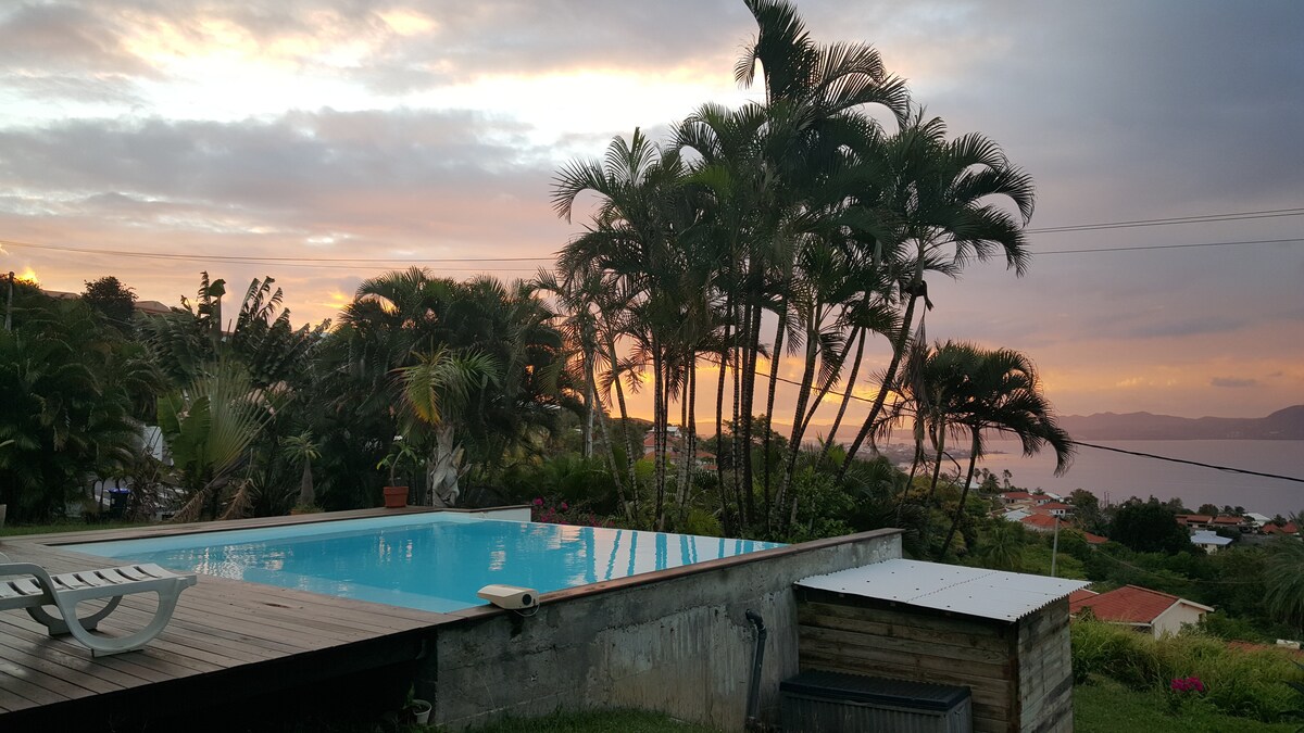 Magnifique vue sur la mer des Caraïbes ! Très belle villa, calme et reposante, située dans une résidence dès plus prisées, qui surplombe la grande baie. Les réveils sont lumineux et les couchers de soleil sont à couper le souffle. Le premier bain de mer à 4 mn en voiture. La villa est aménagée avec goût, des matériaux de qualité et totalement équipée. Piscine au sel. Jardin. BBQ. Localisation idéale pour rayonner partout sur l'île. Parking privé sécurisé pour 2 voitures. Supermarché à 5 minutes.