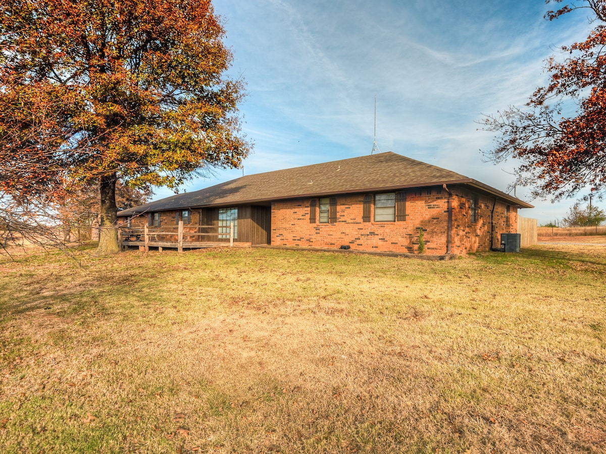 Détendez-vous avec toute la famille dans cette paisible maison de campagne de style ranch sur 10 acres. Les porches couverts à l'avant et à l'arrière donnent sur les pâturages de chevaux. Prenez un café sur le patio à l'arrière ou lisez un magazine dans la balançoire sur le porche avant. Gril Weber à l'arrière avec des lumières pour les rassemblements en soirée et une cheminée pour l'ambiance. Plusieurs grands pacaniers créent un verger ombragé pour les oiseaux sauvages, les dindes et les cerfs. Propriété fermée avec allée pavée.