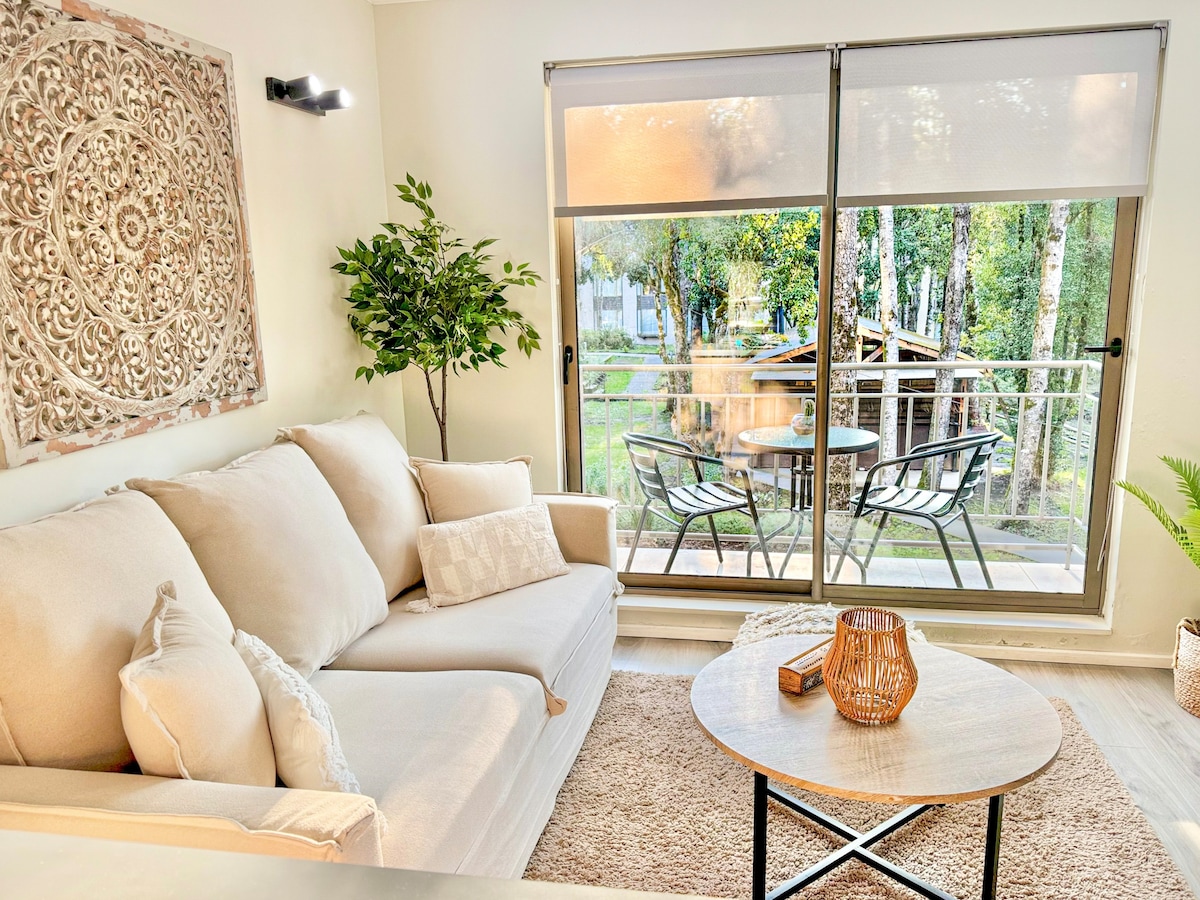 Appartement confortable d'une chambre avec salle de bain attenante, salon-salle à manger et cuisine ouverte, situé dans un condominium privé avec de beaux jardins. Parfait pour 2 personnes. Profitez : 🏊♂️ Piscine adaptée aux enfants et aux adultes 🏰 Aire de jeux pour enfants 🌲 Club house 🧖♂️ Sauna et jacuzzi (frais supplémentaires) Emplacement 📍 idéal, proche de : 🏘️ À 5 min du centre-ville de Pucón 🏞️ Plages À ⛷️ 25 min du centre de ski À ♨️ 40 min des sources chaudes de Huife À 🌿 25 min du parc thermal botanique 🌄