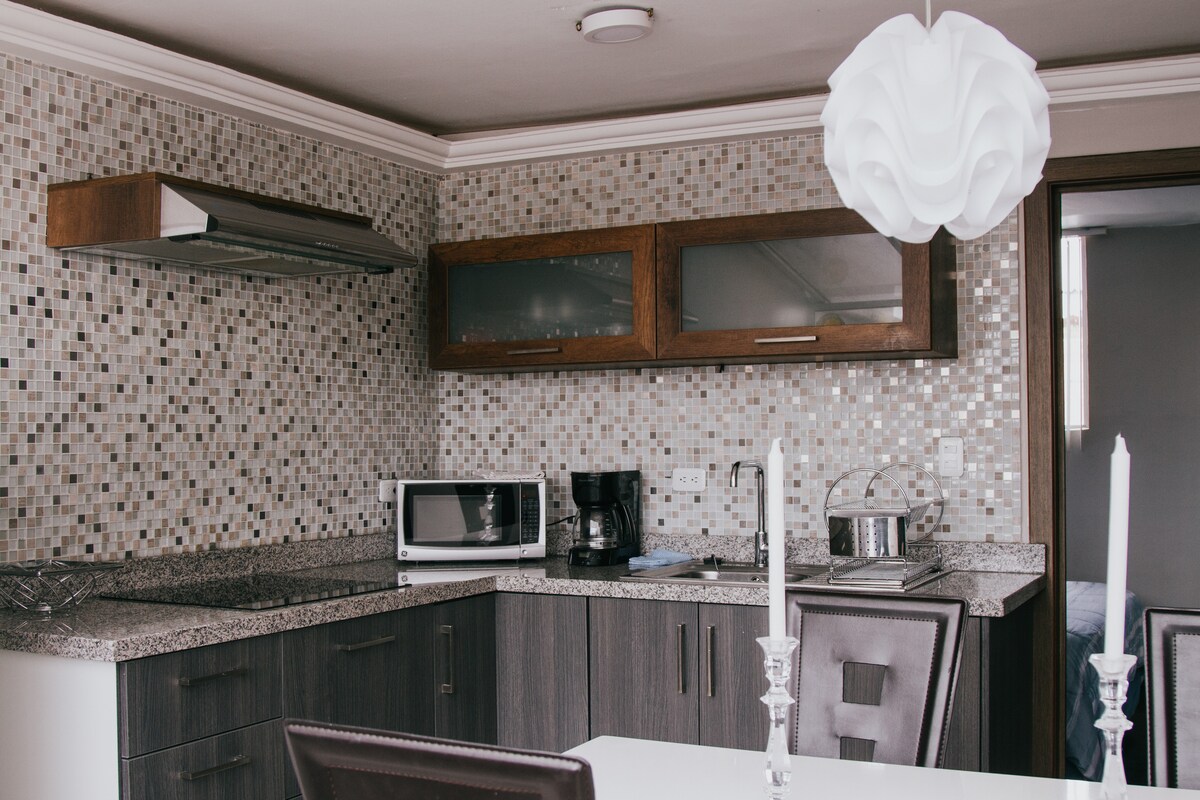 A spectacular brand new Suite located in the best neighborhood of Cuenca "El Vergel". The suite has a Queen size bedroom, 1 full luxury bathroom, spacious equipped kitchen and also a work area equipped with the best internet speed. The surroundings of the suite are incredible, river, parks, gastronomic area, bakery, stadium, city center, historic center, university, Clinics, College, Banks all within a radius of 500 meters.