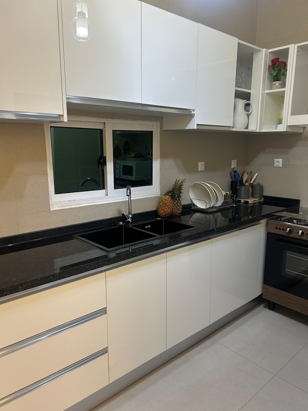 Apartmento todo remodelado, com padrões moderno, todo branco com contraste em cinza. Apartamento com chão todo cerâmico da sala, cozinha e do WC. Quarto com chão flutuante castanho claro. Zona comercial com todos os serviços proximo, restauração, ginásio debaixo do prédio, farmácia debaixo do prédio, clinica sagrada esperança lobito. Banco econômico a 20metros.