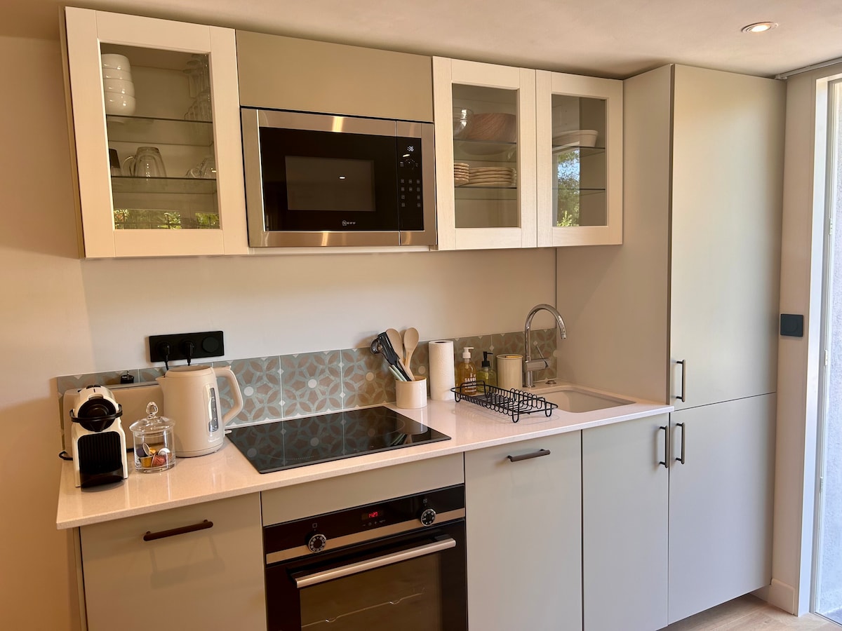 Charmant appartement neuf de 28 m², en rez-de-villa. Idéal couple, petite famille ou déplacement pro. Séjour avec cuisine équipée, coin repas, TV, Wi-Fi, clim. Canapé convertible pouvant accueillir 2 enfants. Suite parentale avec lit en 160x200 et rangements. Salle d’eau avec douche à l’italienne, lave-linge, WC séparés. Cour extérieure avec mobilier, parking privatif. Petit-déjeuner en option. À proximité des plages, du centre-ville et des navettes. GR Location non accessible aux PMR