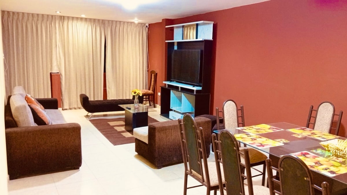 Il se compose d'une pièce avec une télévision de 65POUCES NETFLIX pour votre distraction totale, en plus il a un équipement sonore pour votre confort. Une salle à manger, une cuisine équipée d'appareils et d'ustensiles complets pour votre séjour. Il a trois chambres c/u lit 2 places, téléviseurs Smart en c/u et tables avec chaises, avec armoire encastrée l'un d'eux a une salle de bain privée et les 2 autres avec salle de bains commune. Il dispose d'un garage. Il y a de l'eau chaude toute la journée et un bon signal WIFI. Il a des finitions au top.