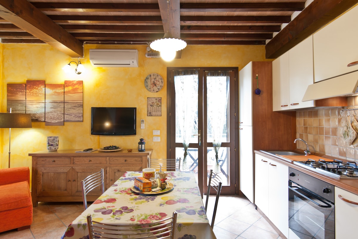 Luminoso e arieggiato appartamento su due piani, soggiorno con divano letto, grande cucina e bagno di servizio al piano terra; al primo piano una camera matrimoniale, una cameretta due letti singoli, bagno con doccia. 30mq di giardino pavimentato dove poter pranzare, cenare, godersi i bellissimi tramonti e il silenzio della campagna nelle serate estive. Posto privato davanti casa per un’auto di media grandezza, altrimenti nella strada privata d’accesso