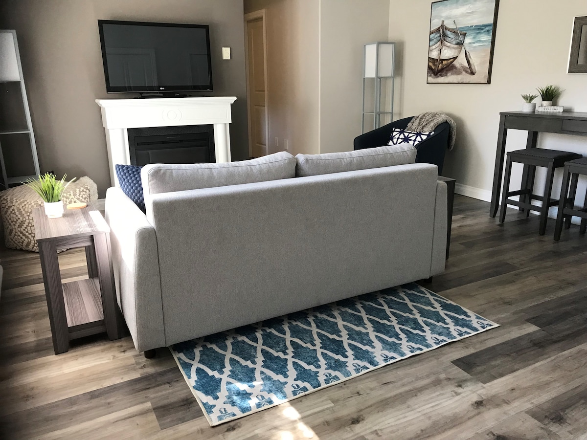 Suite d'une chambre avec 2 lits doubles, une cuisine complète, un salon avec une télévision de 40 pouces et une table à manger. Une laveuse et une sécheuse et une salle de bain complète de 3 pièces sont dans la suite. Chargeur EV disponible moyennant des frais supplémentaires. L'emplacement est dans le sud de Nanaimo. Nous sommes à 10 minutes en voiture du centre-ville et de l'aéroport, de Duke Point et de VIU. Departure Bay est à environ 15 minutes. Le parc de la rivière Nanaimo est à quelques minutes en voiture. Cedar est à 10 minutes. Il y a des transports en commun à proximité avec un arrêt de bus à quelques minutes de marche.