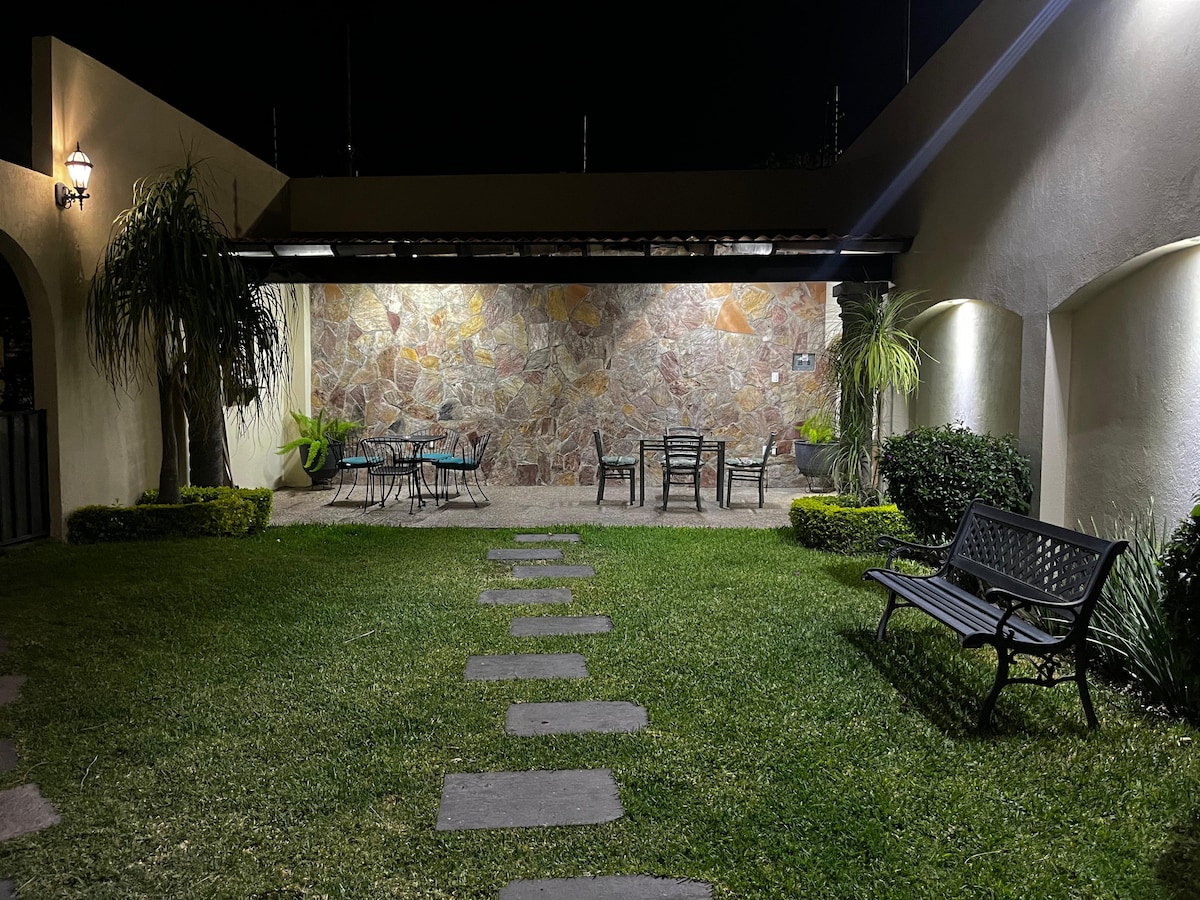 Relájate y acomódate en este espacio hecho para que pases una estancia de lujo con ton todas las amenidades necesarias para tu comodidad , y al mismo tiempo disfrutar del tranquilo y relajante jardín con el que cuenta la propiedad , y todo esto dentro de la ciudad , ubicado en una calle privada con reja y cámaras de vigilancia , a unas cuadras del centro y la alameda , podemos facturar tu estancia sin ningún problema , cuenta con aire acondicionado y cama king así como un sofá cama