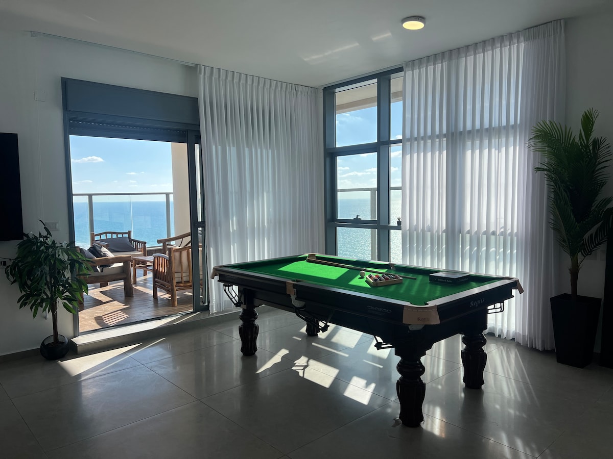 🌴 Lagune DREAM : location de vacances de luxe à Netanya ! Vue imprenable sur la mer🌅, jacuzzi spa luxueux🛁, table de billard professionnelle🎱 Un immense salon, une cuisine entièrement équipée et un balcon ensoleillé avec une ambiance de liberté réelle. Parfait pour les grandes familles, les couples ou les groupes qui veulent passer des vacances à un autre niveau. Conçu pour 8 personnes Mais vous pouvez en envoyer jusqu'à 15. Envoyez un message 💌