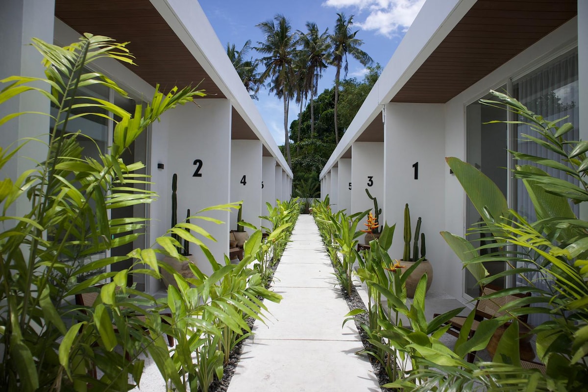 Chambre privée avec salle de bain et douche à ciel ouvert avec eau chaude, lit king size, climatisation et terrasse privée attenante à une autre chambre. Petit-déjeuner inclus, réception ouverte 24h/24 et restaurant sur place. Située à proximité de toutes commodités : bars, restaurants et centres de massage. De plus, avec cette réservation, vous bénéficiez d'une entrée gratuite à la salle de sport Xeno Fit, située à seulement 3 minutes en scooter.