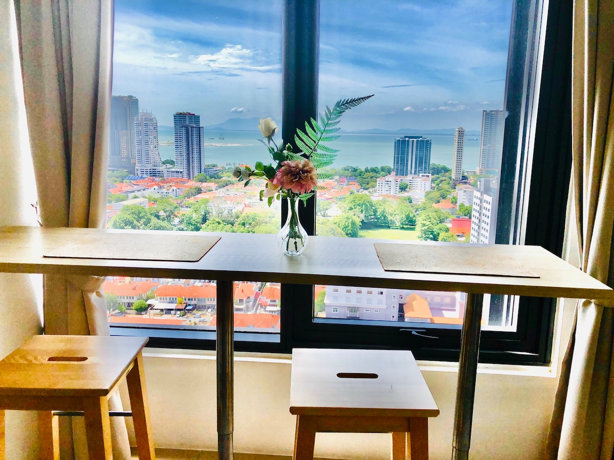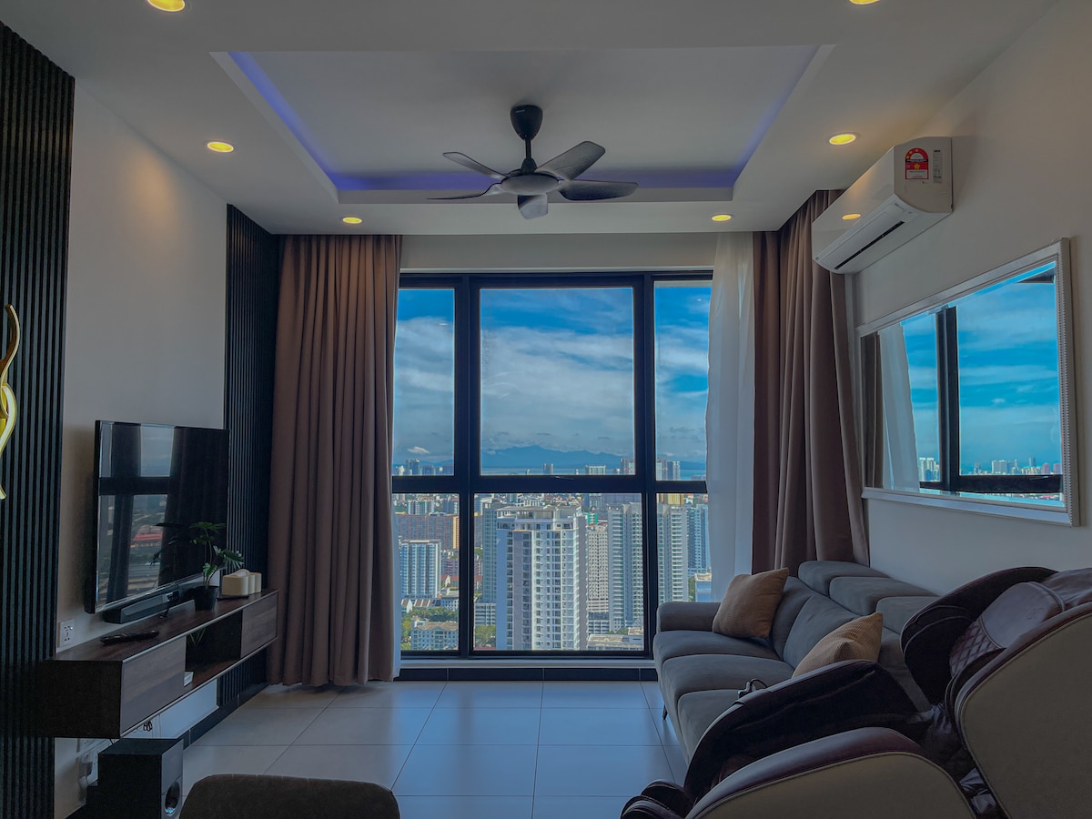 WiFi gratuit, équipé d'une serrure intelligente, d'un chauffe-eau, de la climatisation, d'un four à micro-ondes et d'un filtre à eau qui permet de boire de l'eau chaude et froide immédiatement. 2 places de parking gratuites également. Très proche de Karpal Singh, à 5 minutes de Georgetown avec une superbe vue sur la mer et la ville. Vous pourrez voir le pont de Penang, la vue sur la mer, Komtar depuis ce logement. Situé au 36e étage également. En cas de besoin, je peux discuter avec moi, car je reste juste à côté.