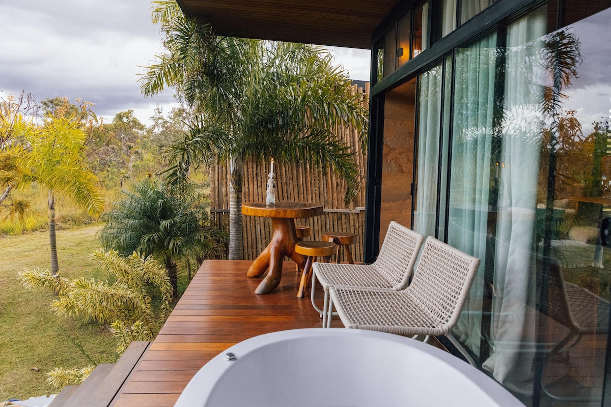 Notre chalet est entièrement intégré à la nature. Elle dispose de grandes baies vitrées et d'une vue dégagée sur le Cerrado et les montagnes, offrant une vue spectaculaire. Cuisine équipée, linge de lit et de bain haut de gamme, douche chauffée, placard et lit avec matelas d'hôtel 5 étoiles. Il y a un balcon avec une terrasse sur toute la longueur du chalet, avec une table et des chaises à l'extérieur afin que les voyageurs puissent contempler la nature et le ciel étoilé de Chapada, tout en prenant un verre de vin dans le jacuzzi !