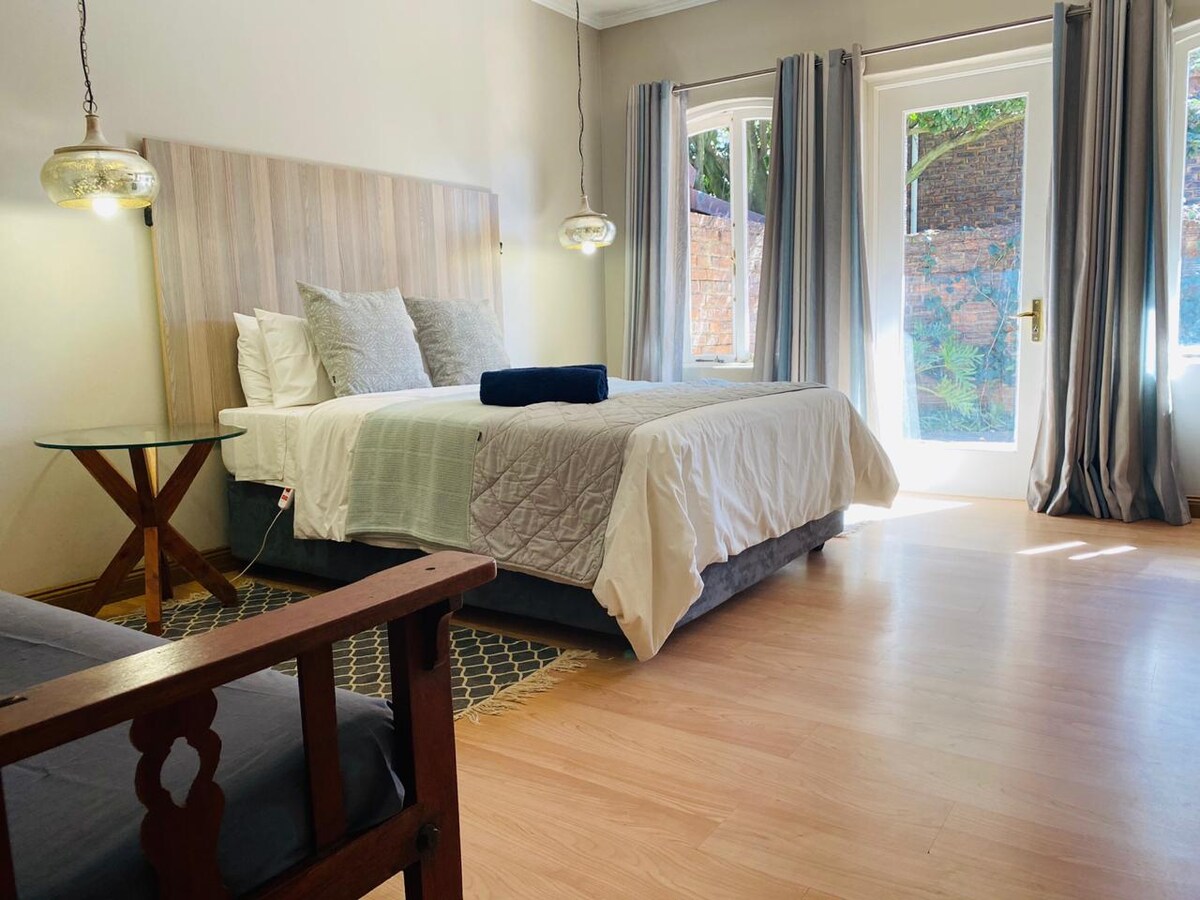 Chambre confortable dans un vieux quartier verdoyant, avec salle de bains privative, cuisine et entrée privée. Télévision avec YouTube et MFC. Parking couvert à côté de votre chambre. Uber et Uber-eats disponibles. Proche de l'hôpital Unitas, de la gare Gautrain, du centre commercial Centurion, de la clinique ophtalmologique, du théâtre Centurion et du Supersport Park. Nos chambres sont idéales pour une nuit de séjour lorsque vous voyagez, car nous sommes à proximité des principales autoroutes N1, N14 et R21 et à seulement 40 minutes des aéroports OR Tambo et Lanseria. PAS de délestage des charges !
