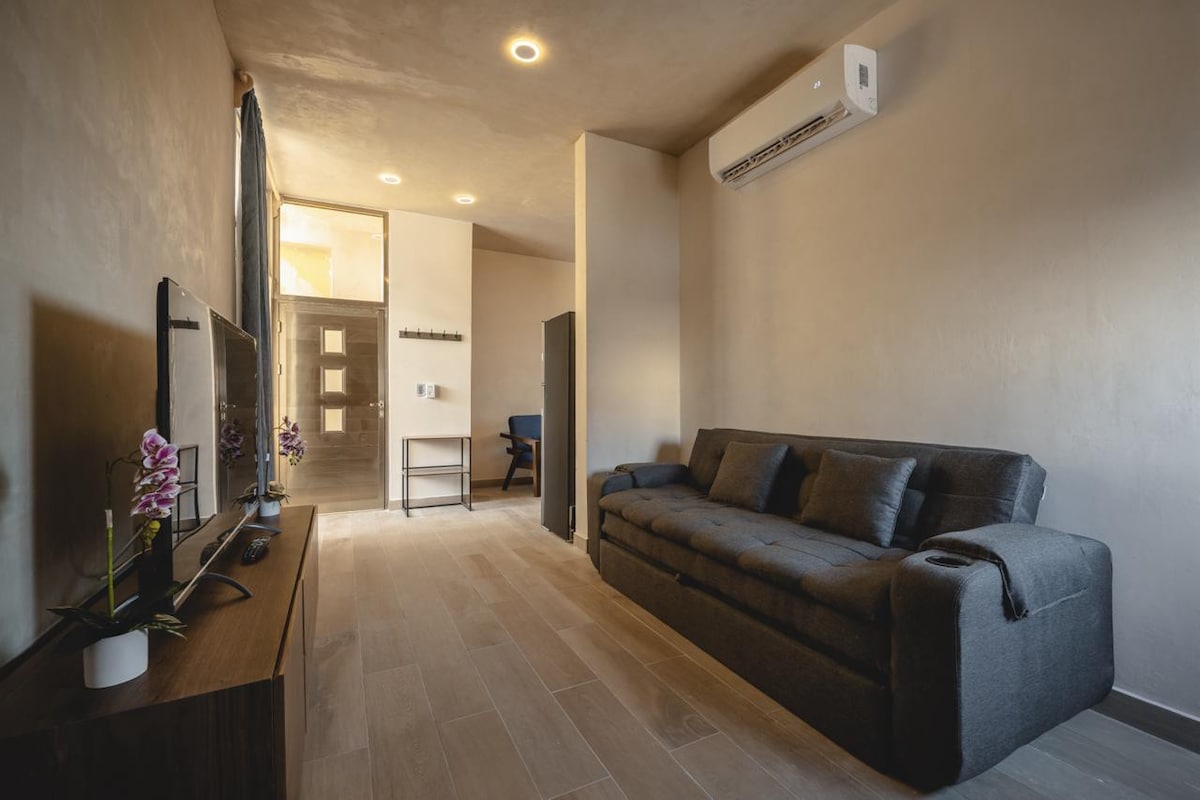Studio 41. Un espace confortable entièrement rénové. Il est situé à 10 minutes de l'aéroport international de Cancún et à 10 minutes du centre. L'appartement est réparti en 1 chambre avec salle de bains complète et un espace salon avec cuisine. La cuisine comporte un lave-vaisselle, un réfrigérateur, une cuisinière électrique et toute la vaisselle. C'est un espace calme, confortable pour les courts séjours et idéal pour les longs séjours.