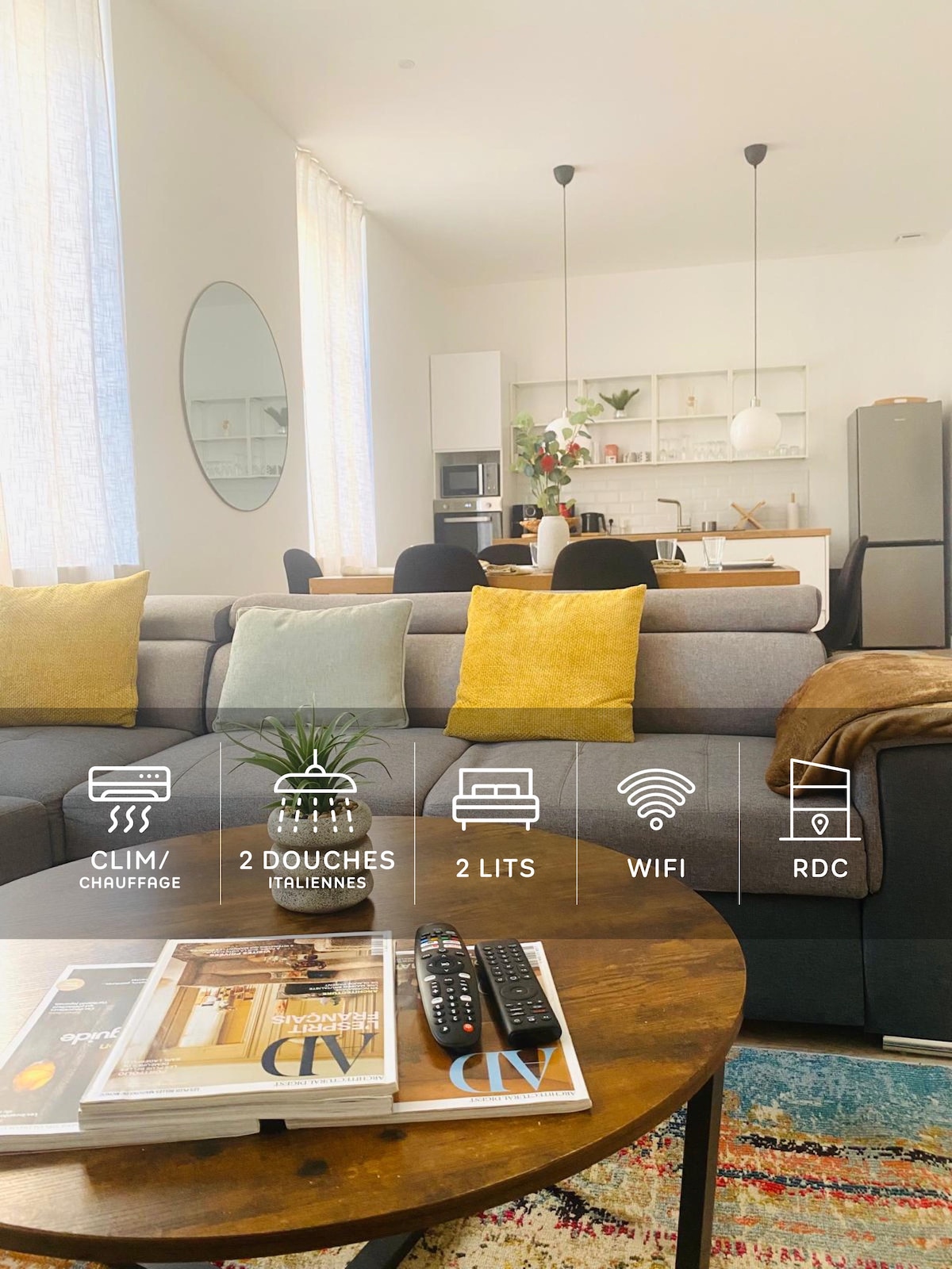 Bienvenue dans cette maison élégante, entièrement rénovée en 2023. Elle comprend 3 chambres : 1 au rez-de-chaussée avec lit 160/200 et accès direct au patio 1 à l’étage avec lit 140/190 1 en enfilade avec 2 lits 90/190 (transformables en 180/190 sur demande) 2 salles de bains (1 à l’étage, 1 au rez-de-chaussée), une cuisine équipée, un patio, un garage, et un WC séparé. Un espace lumineux et confortable, parfait pour un séjour agréable.