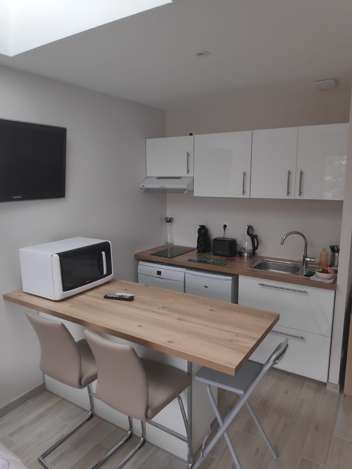 logement 45 M² comprenant une chambre ,cuisine équipée, une pièce de vie avec canapé lit,salle de douche avec WC. La capacité d’accueil est de 4 couchages. Le logement refait à neuf est situé au sein d’un manoir du 16 et 17 ° siècle, dans un lotissement privé, au calme, avec vue sur un parc boisé. Quartier des 2 LIONS de TOURS, vous serez à 15mn en tramway du centre de Tours (arrêt du tramway à 300 mètres). Espace extérieur avec table et chaises pour profiter de la douceur tourangelle