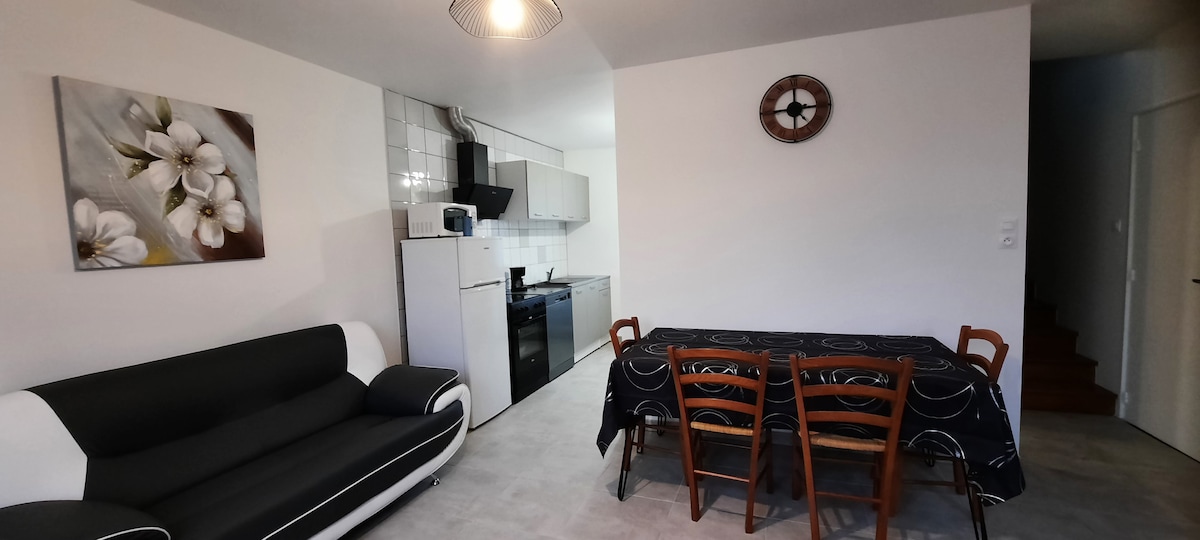Au coeur de Champagnole, appartement chaleureux esprit chalet au 1er étage d'une maison ancienne en pierre pouvant accueillir de 2 à 4 personnes. Une pièce à vivre confortable avec cuisine équipée, TV connectée (Netflix, Amazone prime video…) et un canapé-lit de qualité. Une chambre avec un lit 160x200 (draps qualité hôtellerie) et TV donnant sur une salle de bains avec douche à l'italienne. Emplacement idéal entre montagnes, lacs, vignobles et cascades. Meublé de tourisme classé 3 étoiles.
