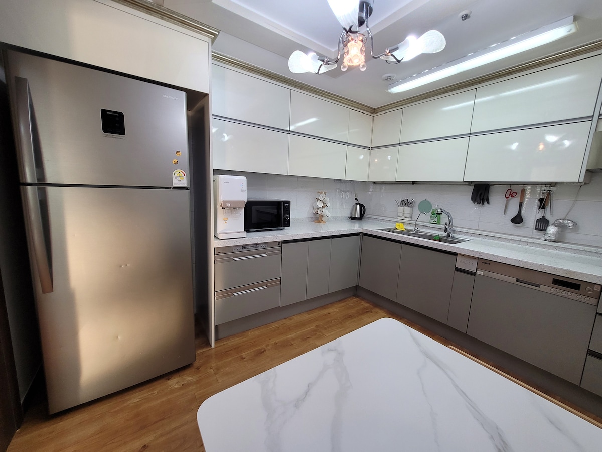 [5 minutes de la gare de Busan] #Vue sur l'océan#Hauteur#Parc aquatique|124m²|9 personnes maximum|4 lits|Cuisine et lessive|Bagagerie et parking gratuit