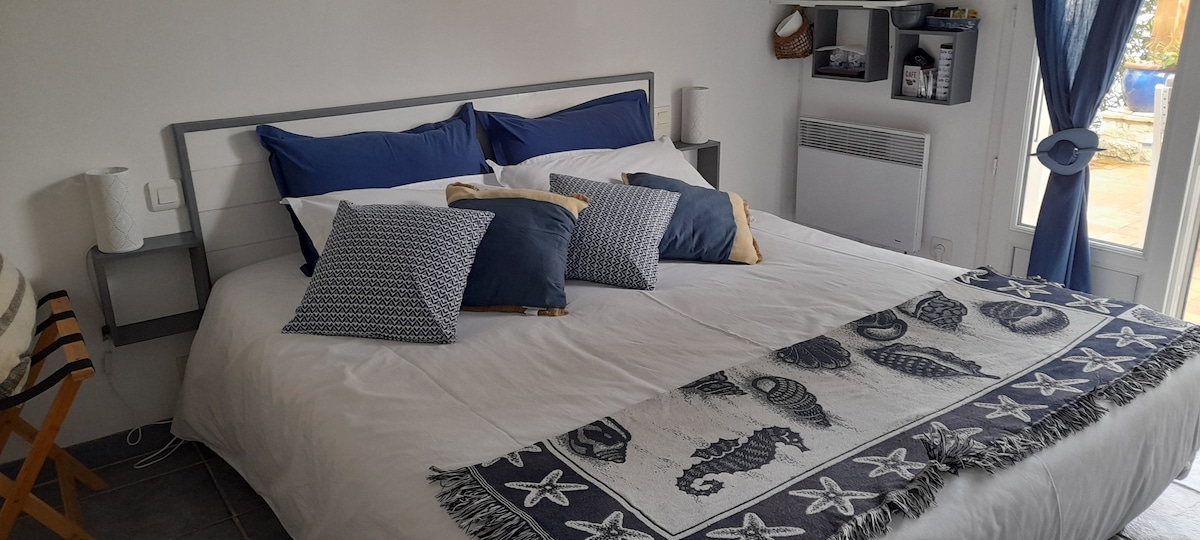 vous apprécierez le calme , votre chambre donne sur jardin et terrasse (lit de 180) (et sur demande un lit de 90 pour la 3eme personne dans la chambre attenante ), salle de bains ( douche italienne, vasque, et wc ) ; frigo, bouilloire, grille pains, mobilier extérieur petit déjeuner sur demande en supplément proximité de la plage et du centre ville , marché ouvert tous les jours Télétravail possible bureau attenant jolie petite station balnéaire proche îles Ré Oleron Aix