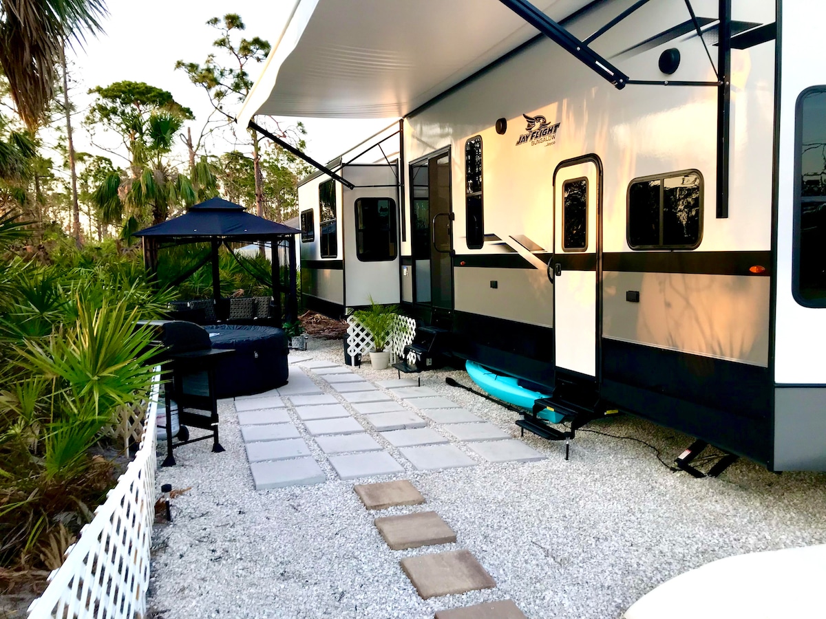 Convient aux chiens et magnifique 3 lits/1 salle de bain, NOUVEAU caravane design à quelques minutes du sable dans l'est haut de gamme d'East Englewood/Port Charlotte. Incroyable jacuzzi, immense cour clôturée privée, belvédère avec moustiquaire, BBQ, kayak et chaises de plage. Wi-Fi ultra-rapide (200 GBIT/S), Netflix gratuit, Paramount, Peacock et plus encore ! Télévision HD 50". Notre NOUVEAU camping-car design super propre dispose d'une excellente climatisation, d'une eau chaude puissante, d'une fosse septique et de 7 couchages. L'escapade de luxe ultime ! Restaurants/magasins et vie nocturne à quelques minutes. Paradis !