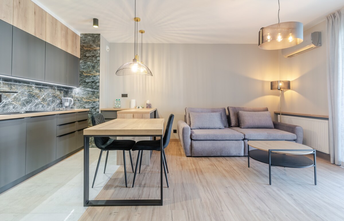 Nouvel appartement élégamment décoré dans un immeuble à côté de la vieille ville historique de Nikiszowiec Katowice. Deux chambres - une spacieuse, lumineuse avec un lit super confortable, l'autre plus petite, calme avec un espace de travail et un canapé-lit confortable. Salon lumineux et élégamment meublé, relié à une cuisine entièrement équipée (four, plaque à induction, micro-ondes, lave-vaisselle, machine à café). Dans le salon, une porte avec accès à un petit balcon avec deux fauteuils. Calme, confortable et à deux pas de la vieille ville.