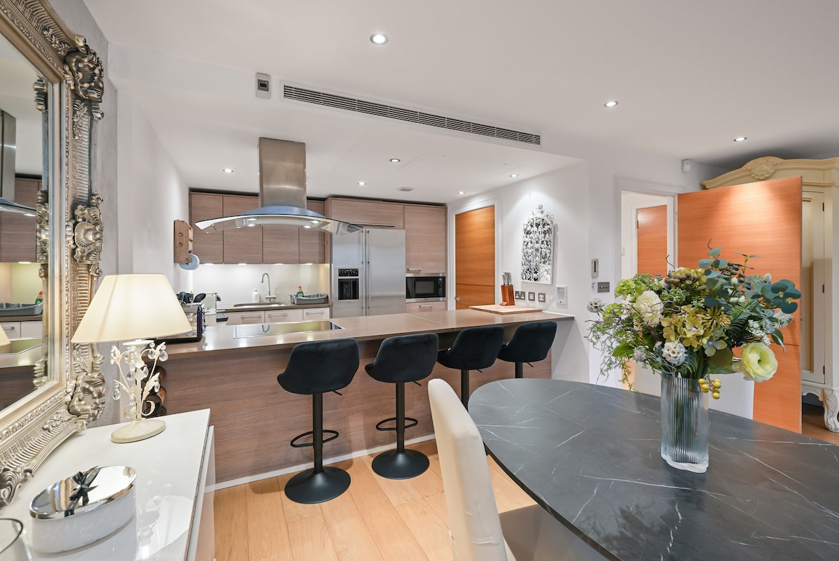 Superbe appartement de luxe de 2 chambres et 2 salles de bain à Chelsea Creek. Un salon lumineux et ouvert et une cuisine entièrement équipée s'ouvrent sur deux balcons privés, idéaux pour prendre un café ou un verre en soirée. Chambres et salles de bain élégantes, parfaites pour les couples, les familles ou les voyageurs d'affaires. À seulement 3 minutes à pied de Imperial Wharf Overground (direct vers Clapham Junction et le centre de Londres) à proximité des bus, des cafés, des magasins, des restaurants et de Chelsea Harbour.