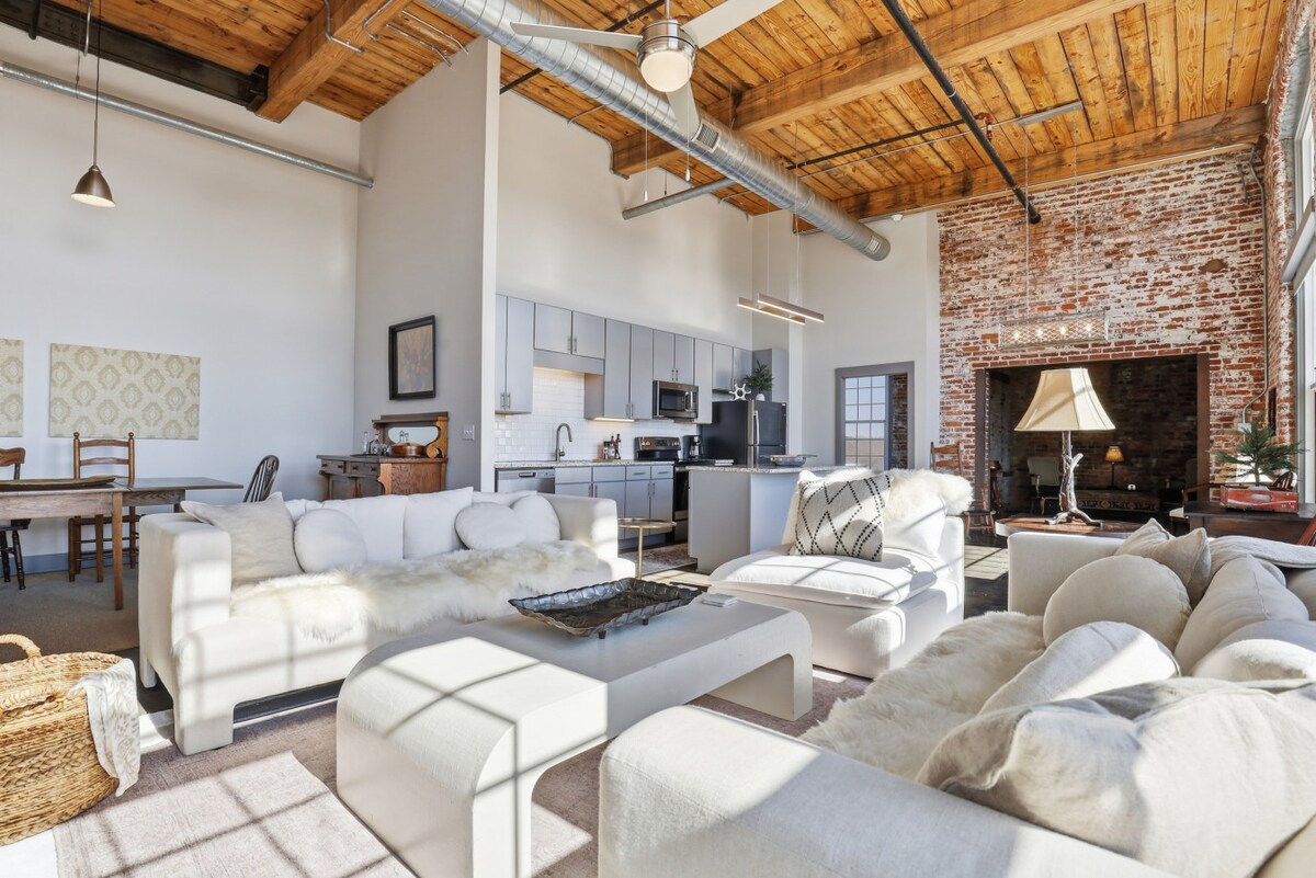 Top floor historic loft at Converse Mill with breathtaking River Views. This spacious two bedroom, two bath unit features soaring ceilings, original brick and wood beams, and oversized windows filled with natural light. Both bedrooms offer king beds and walk in closets, plus a sofa bed for extra guests. Enjoy a full kitchen with island, elevator access, pool, gym, and prime location near I-85, Spartanburg, and Cowpens. Sleeps 6 comfortably.
