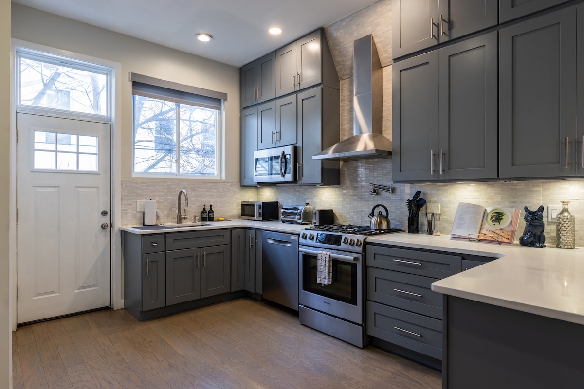 Beautiful modern 2 bedroom row home on a quiet block that is newly renovated for a very comfortable stay. Netflix, Amazon Prime, Alexa, Bluetooth speaker, Keyless entry and an Office with printer. The back patio/pergola and garden is great place to have your coffee in the mornings or an evening drink. Comfortable, quiet bedrooms with luxury memory foam mattresses, soft sheets and blackout shades. Cafe, bar and restaurant within a block.