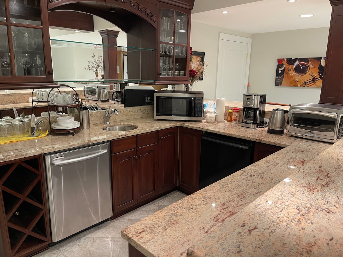 Amusez-vous et détendez-vous dans cette oasis élégante ! Emballé avec équipements. Grande piscine avec plusieurs cabanes, JACUZZI, trampoline, aire de jeux, lancer de hache, table de hockey sur glace, arcade,immense salle de théâtre et projecteur extérieur aussi, terrain de basket-ball, barbecue, spa/bibliothèque avec sauna et salle de sport complète ! ! 5 lits confortables. Chambres séparées pour plus d'intimité. Cuisine ouverte/salle à manger/salon. Fontaine d'eau froide DeerPark. Appartement au sous-sol donc il y a un peu de bruit de mouvement. Bain rénové et douche extérieure. À 20 minutes de DC et de National Harbor