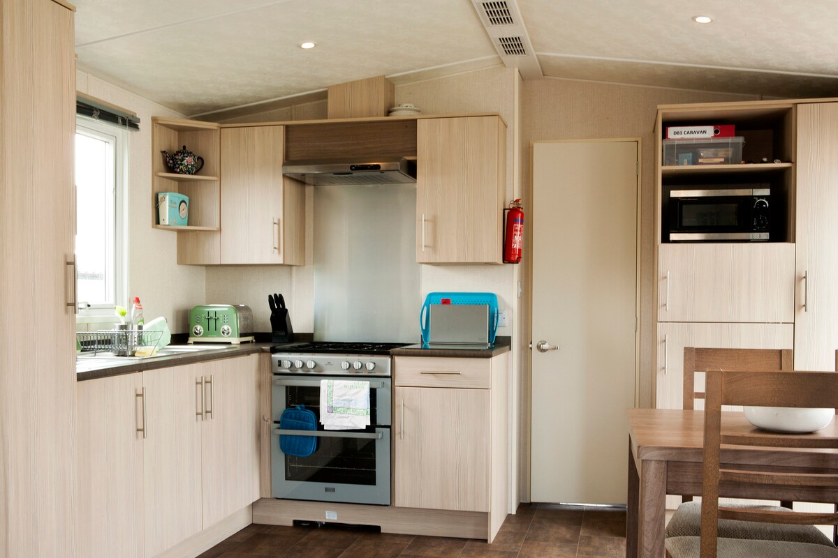 Dans cette caravane se trouvent un lit double, des lits jumeaux de 2 pieds de large et un canapé-lit double dans le salon. Chauffage central dans tout le logement. La cuisine est entièrement équipée et comprend toute la vaisselle, les ustensiles de cuisine et les couverts. Il y a une cuisinière à gaz avec gril, un réfrigérateur-congélateur de grande taille, un four à micro-ondes, un grille-pain et une bouilloire, une télévision 32" avec Freeview intégré, un lecteur DVD et un lecteur radio/CD. Veuillez noter que le stationnement attribué à la caravane se trouve du côté de la porte de la caravane. La High Street et la plage de Swanage sont à 20 minutes à pied.