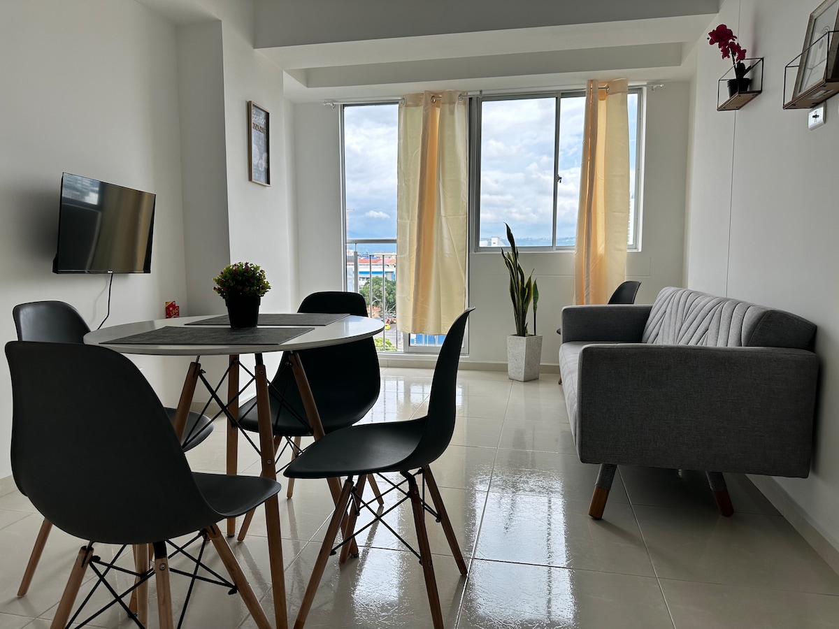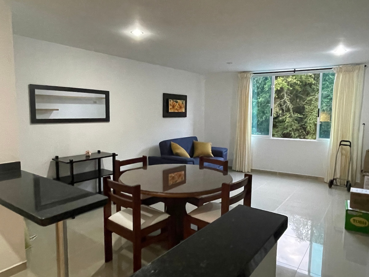 Cet appartement situé au centre est idéal pour profiter d'un séjour agréable si vous voyagez pour le tourisme ou le travail, a une capacité pour 4 personnes dans deux chambres, la chambre principale dispose d'un lit double, la chambre supplémentaire dispose d'un lit simple et de deux canapés-lits confortables dans le salon, d'une cuisine entièrement équipée et d'une salle de bain avec eau chaude. Il dispose d'une excellente bande passante Internet mobile de 300 Mpbs, de la télévision par câble, de Netflix, de meubles de travail et est situé à quelques minutes des sites d'intérêt de la ville.