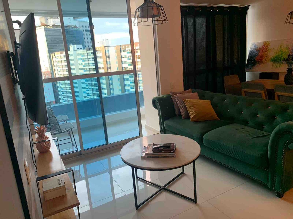 Bel appartement tout neuf. 10e étage avec vue imprenable sur le coucher du soleil. Emplacement central. Quartier résidentiel et sûr à côté du centre commercial Cacique et du centre de congrès Neomundo, accès facile à Carrera 33, Cabecera, Girón et Floridablanca. 2 chambres, 2 balcons, hamac, 2 salles de bain, 2 lits, un lit auxiliaire et un canapé-lit. Excellent éclairage et ventilation, WIFI 300 Mbps, 2 téléviseurs avec accès à DirecTvGO, Netflix, Amazon et HBO. Rez-de-chaussée du complexe avec supérette, boulangerie, pharmacie, entre autres.