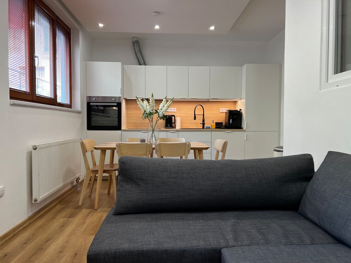 Gentleman Spirit Residence Prague Découvrez l'élégance intemporelle à Gentleman Spirit Residence Prague, où la sophistication rencontre un confort inégalé. Située au cœur du célèbre quartier de Zizkov, cette luxueuse résidence rayonne d'une aura spirituelle, avec ses riches textures, ses meubles sur mesure et sa touche charismatique de vitalité et d'énergie sombre. Profitez de la cuisine entièrement équipée, détendez-vous dans l'élégant salon et reposez-vous dans un confort ultime, entouré d'une atmosphère qui inspire et se recharge.