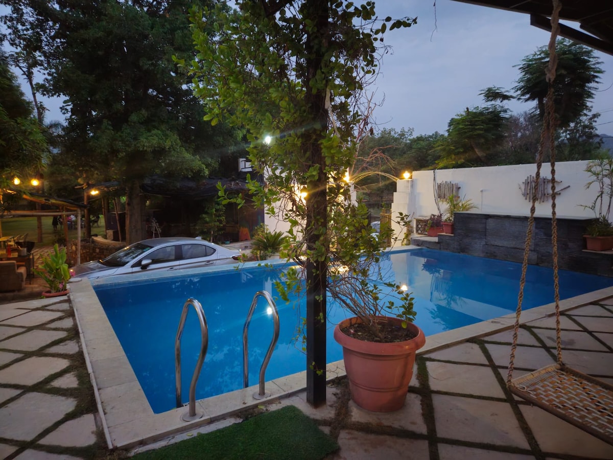 Située dans l'étreinte de l'Aravalli, notre villa de 7 chambres est un micro complexe idéal pour un grand groupe de 20 personnes. Réparties sur 3 unités indépendantes, chaque villa dispose de sa propre piscine privée avec un belvédère, offrant aux voyageurs la liberté de profiter de l'intimité. 2 des 3 unités comprennent des espaces de vie spacieux. Chaque chambre est équipée de salles de bains attenantes qui offrent une expérience de baignade agréable. Il y a deux baignoires en plein air et 1 douche fermée et 2 douches extérieures qui donnent une sensation de station balnéaire à votre séjour.