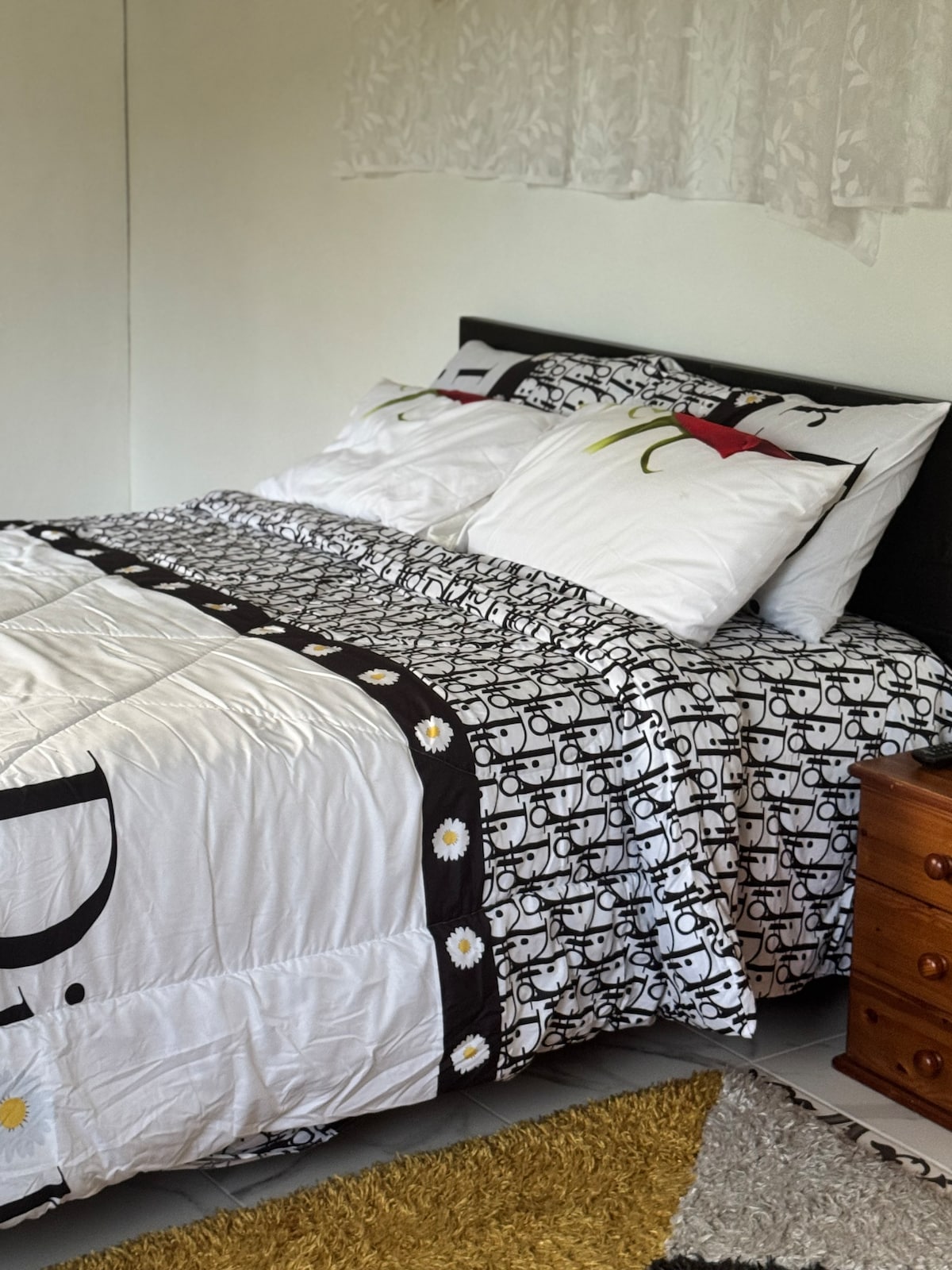 Détendez-vous dans cette maison sereine et spacieuse de 2 chambres, parfaite pour les couples, les familles ou les voyages d'affaires. Niché dans un quartier calme, ce havre de paix comprend : 🛏️ Deux chambres confortables 🍽️ Cuisine entièrement équipée 🛋️ Salon ET salle À manger 🚿 Salle de bain propre Porche 🌿 confortable pour se détendre Ventilateur de plafond dans le salon ❄️ Climatisation uniquement dans la pièce avant 🏊 Accès à une piscine partagée Eau chaude et froide écologique - alimentée par l'énergie solaire
